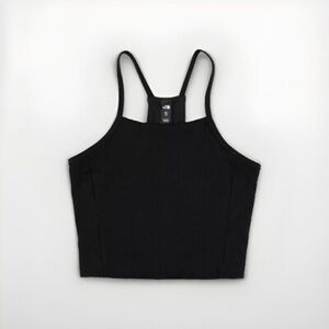 This sleek black tank top from The North Face features a fitted, cropped design perfect for athletic or casual wear. The sleeveless style and classic scoop neckline offer a comfortable and stylish fit. Made from a stretchy material, it provides excellent support and compression for various activities.
