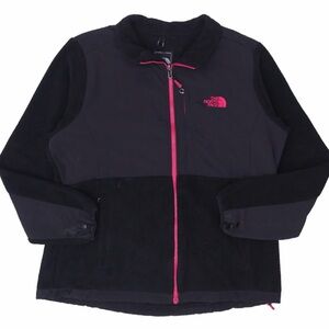 Fleece black jacket featuring vibrant pink trim. Iconic logo on chest. Ideal for outdoor wear.