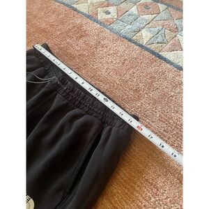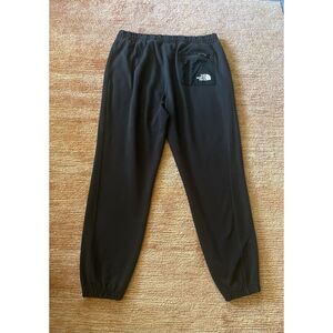 Men’s black pull-on jogger pants by The North Face, made in Guatemala. Soft stretch fabric with elastic waistband and adjustable drawcord. Two side pockets and one zip pocket on the back with The North Face logo print. Cuffed hems. No zipper or button closure — easy pull-on style. In very good condition.