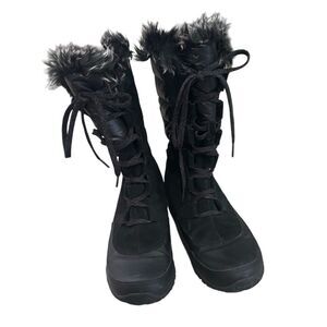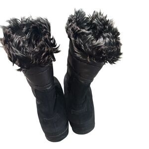 These are preowned black snow boots. They are insulated and often described as waterproof or water-resistant, suitable for snow and cold weather. The top of the boot, around the calf, is adorned with faux fur for warmth and style. No major flaws.