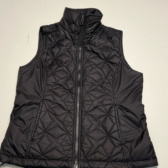 Sleek black quilted vest. Features full zip closure. High collar for added warmth. Two zippered pockets.