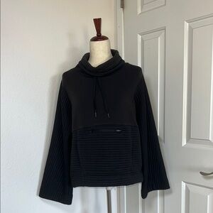 Chic black pullover with ribbed texture. Features wide sleeves and front pocket. Ideal for casual outings.