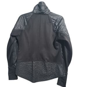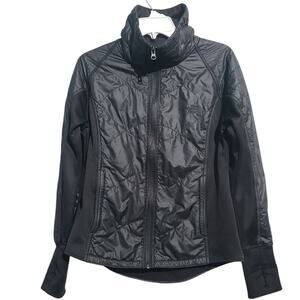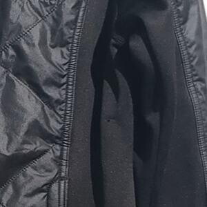 Description: The North Face Black Vidali Hybrid Jacket, size L, used with good condition. Features 100% polyester, front zip closure, front zip pockets, thumbholes in cuffs to keep hands warm and sleeves from creeping up, mixes quilted taffeta and strategic fleece panels for wind resistance and cozy warmth, high stand collar past the chin, extended rib-knit cuffs, perfect for outdoor or casual wear despite small snag on side panel rib area. Smoke-free home, fast shipping, bundle to save!
