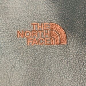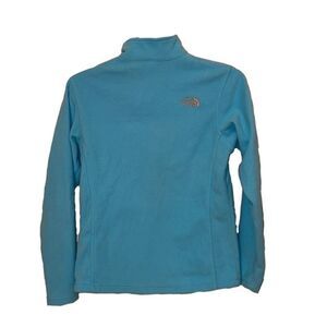 Long sleeve, pullover, mock turtleneck, front zipper, sky, turquoise blue, fleece by The North Face in a girl's size large (14/16). Fitted with no pockets. Lightweight. Embroidered logo on front and back. Approximate measurements shown in photos. Machine washable. In good pre-owned condition with signs of wear from normal use.