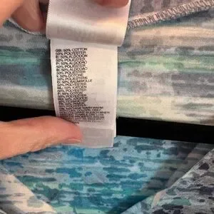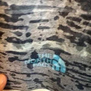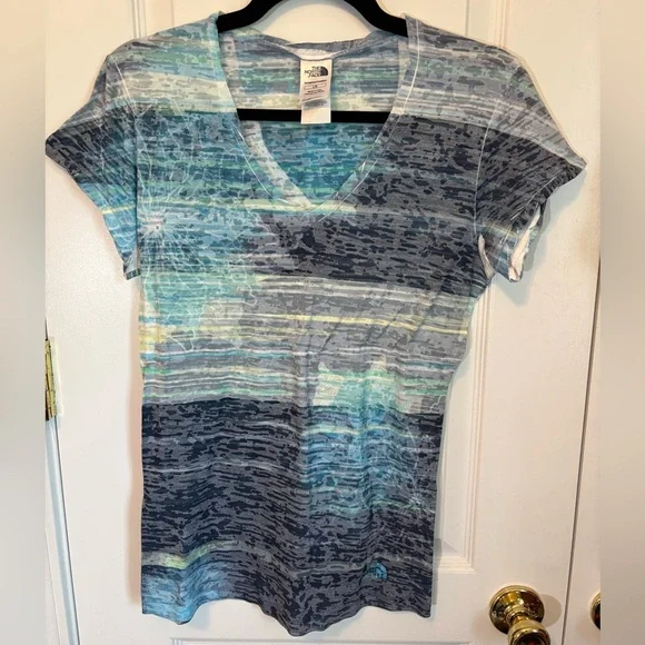 Stylish and comfortable The North Face women’s V-neck tee featuring a unique blue, teal, and gray abstract stripe pattern. This lightweight shirt is made with a soft cotton/poly blend that makes it breathable and great for everyday wear.