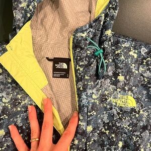 Lightweight and stylish The North Face rain jacket in a unique blue/green floral print with bright yellow zippers. Fully hooded with adjustable drawstrings, zippered pockets, and breathable mesh lining—perfect for hiking, travel, or everyday wear.