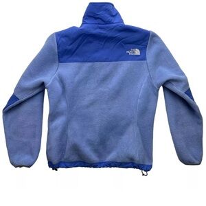 This vibrant royal blue fleece jacket from The North Face features an attached hood and a full-length zipper for easy wear. The stylish two-tone design includes a lighter periwinkle blue on the lower part, making it a perfect choice for both warmth and fashion.