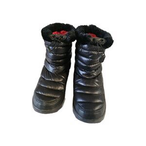 The North Face Women's Boots are in Excellent Condition a stylish and functional choice for the winter season. With a round toe shape, lace-up closure, and low heel height, these boots offer both comfort and practicality. The waterproof feature and mid-calf shaft style make them perfect for outdoor activities in snowy conditions. The black synthetic upper material, rubber outsole, and standard shoe width ensure durability and stability. These boots from The North Face are a practical and fashionable addition to any woman's footwear collection.