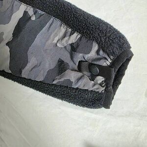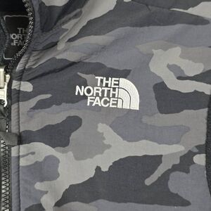 The North Face boys’ full-zip fleece jacket featuring a black Polartec sherpa body with grey camo panels. Warm, lightweight, and durable—great for school, layering, or outdoor wear. Two zip pockets, elastic cuffs, and embroidered logo. Pre-owned with normal light wear; name tag marked over.