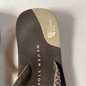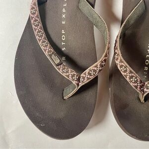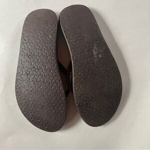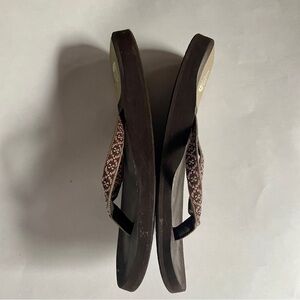 Stylish sandals with a comfortable fit. Features a brown sole and pink patterned straps. Perfect for casual wear.