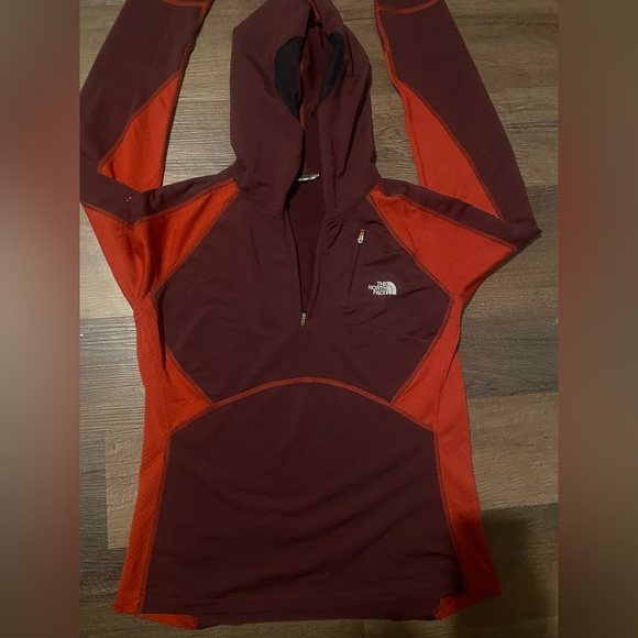 The North Face pullover with a burgundy and red design. Ideal for outdoor wear. The tag is cut out