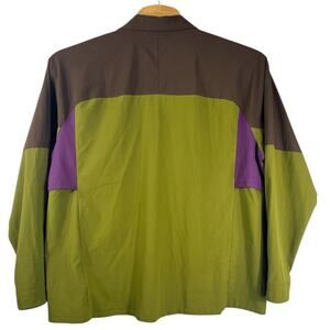 Featuring a unique blend of dark green, brown, and purple hues, this shirt is sure to turn heads. The convenient zipper chest pocket adds functionality and style.