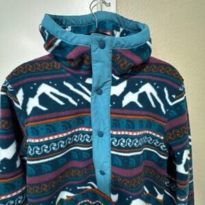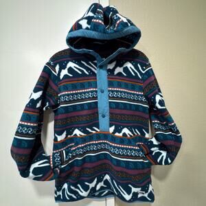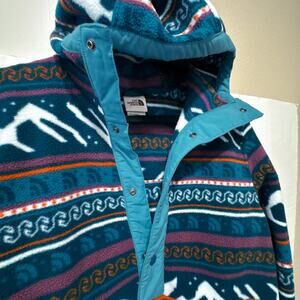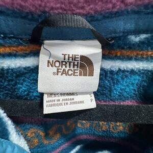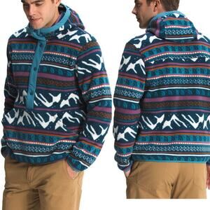thenorthface, north face fleece, carbondale 1/4 snap, mountain print, summit navy, retro fleece, outdoor gear, recycled fleece, vintage style jacket, men’s small, hooded pullover, hiking fleece, eco conscious