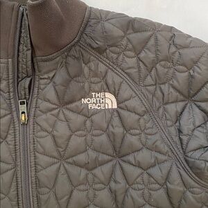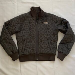 Charcoal gray lightweight quilted bomber style jacket by The North Face in size small. Features a full zip and warm design.