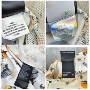 FEATURES: Spring 2021 NF0A5A5X Vintage white valley sun print. Embroidered logo on left. Faux-fly front. Elastic waist, built in drawstring. Angle pockets. Zip back pocket.