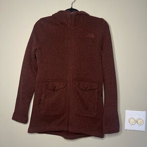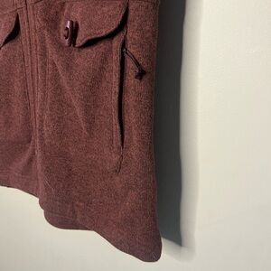 Pretty burgundy brown color. Size small. Outer material is a knit with a fleece lining. Internal cinch. Pockets have toggled and a side zipper. Hooded. No flaws.