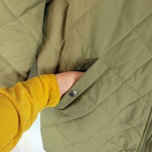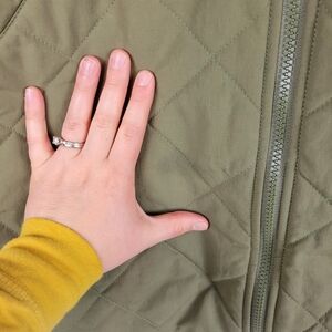 Has a small mark on front and back (see photos), longline longer length, sherpa lined body with quilted sleeves, zipper front.