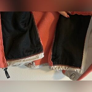 Cozy fleece jacket with a stylish salmon pink and gray design. Perfect for chilly days and for layering over a hoodie. Please note the pilling on the inside where to pockets are but otherwise in great condition. Size says small but it’s oversized! I am a large and it fits me.