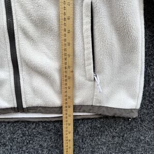 The North Face Denali Jacket is a stylish and warm outerwear option for women in size large. Made with white fleece Polartec material, this short jacket features a full zip closure and a solid pattern with embroidered accents. It is suitable for casual occasions and has a preppy outdoor theme, making it a versatile piece for the winter, fall, and spring seasons. This basic jacket also includes a collared neckline and bodywarmer design, perfect for adding a touch of style to your wardrobe.