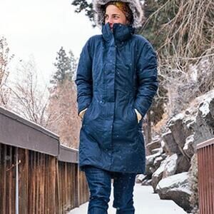 long sleeve, full zip, snap button, faux fur hood, winter, outdoor, outerwear, gorpcore, ski, arctic, down jacket, parka jacket, goose down filled, warm, coat