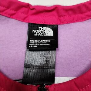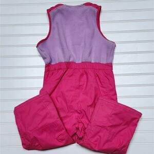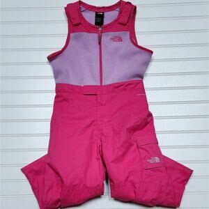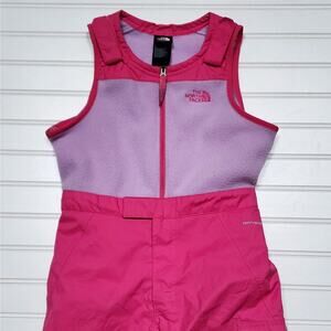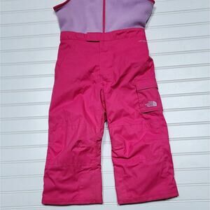 The North Face Dryvent Insulated Kids Snow Bibs/Snow Pants, size 4T, pink, zip up front, adjustable straps, velcro cargo pocket, snow gaiters, fleece top, fleece top has normal fleece wear, seat and bottom of pant legs have some light staining...see pics, showing up more in the last pic, otherwise in good condition. Just cosmetic.