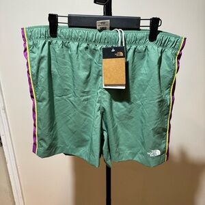 The North Face Elevation Shorts in men's size medium feature a 5" brief-lined design in green and purple colorblock. Made of polyester, these athletic shorts are perfect for various activities such as gym training, walking, yoga, hiking, and running. With a regular fit and drawstring closure, they offer comfort and support for active occasions. The North Face brand ensures quality and durability, making these shorts a great choice for outdoor adventures and athletic pursuits