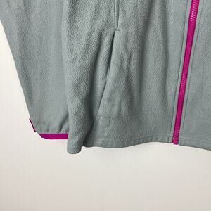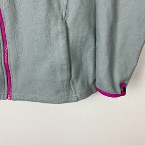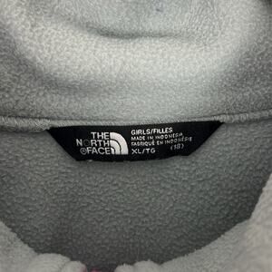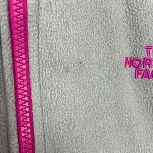 Used The North Face Full Zip Fleece. This is a girls XL. Put used because of a spot where the fleece is light/gone. See pic. Light grey color with pink accents on the zipper and sleeves. Side pockets. Medium weight, very cute!