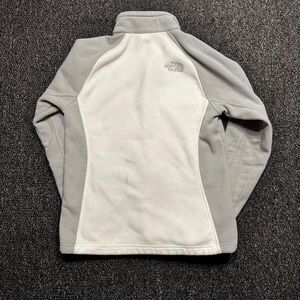 Keywords: North Face women’s fleece, white gray zip jacket, outdoor TNF medium jacket, embroidered logo fleece, casual cold weather layer