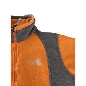 Snuggle up in this cozy The North Face fleece jacket! This pre-owned jacket is in great cosmetic condition, free of any stains or tears. It features a full zip design and a stylish orange and gray color scheme, perfect for adding a pop of color to your outdoor or everyday wear.