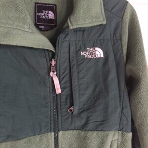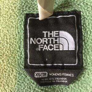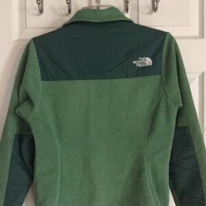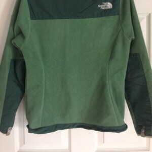 In excellent condition is a North Face women's fleece jacket, great for the outdoors and skiing/snowboarding, drawstring bottom, snap on sleeves for gloves, pine green color, nylon slicker outter across chest/shoulders, 3 zip pockets, size extra small.