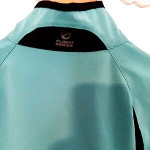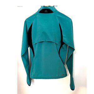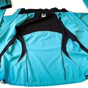 This is an excellent women's The North Face Flight Series Apex stretchy windbreaker size medium. The black is stretchy venting mesh. Venting across the shoulder blades, as well. Thumb holes at bottom of cuffs. Full zip. Smooth zip vertical chest pocket. Bottom has adjustable stretch cord for a nice fit. Excellent for outdoor sports; golf, tennis, running, etc. The color is a pretty greenish teal.