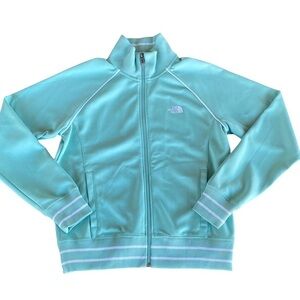 The North Face Retro Look Track Jacket-Women’s Size Large. A Light Mint Blue color with White piping and accents. Rib knit collar, cuffs and hems with varsity stripes. Pockets at front, full zip closure. Great preowned condition with minor wash wear. There is a small spot on the sleeve (see last pic).