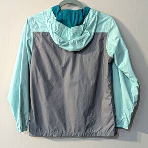 Lightweight hooded full-zip windbreaker. Mint green (top and sleeves), teal (mid-section), and gray (lower body and back)