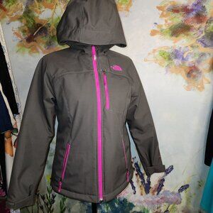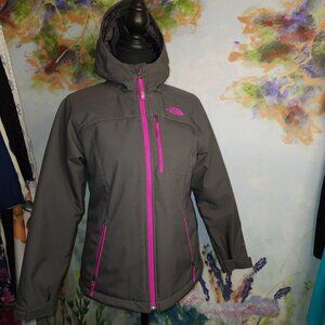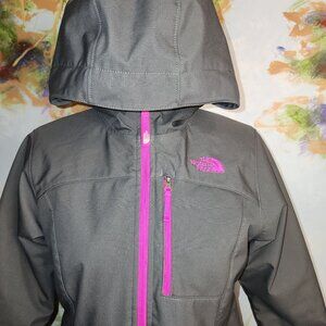 Imagine the cold winds blowing as you zip up this snug and stylish North Face jacket. The rich gray fabric, accented with vibrant pink zippers, ensures you stay warm while turning heads. A perfect blend of fashion and functionality for every adventure.