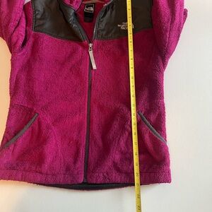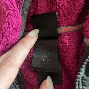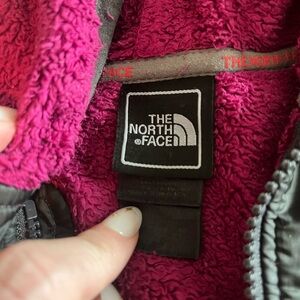 Warm fleece jacket by The North Face. Magenta body with black shoulders. Ideal for cool weather. In used condition. Please see pictures. Girls large 14/16