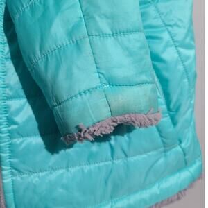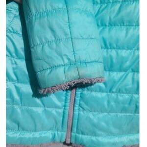 Description: The North Face Girls' Reversible Mossbud Swirl Jacket, size L, good condition. Features water-repellent taffeta exterior with horizontal quilting, soft Silken fleece interior, welt hand pockets on both sides, embroidered logos on left chest and back right shoulder, 100% polyester taffeta with DWR reverses to 360 g/m² high-pile Silken fleece, perfect for outdoor or casual wear despite stained cuffs. Smoke-free home, fast shipping, bundle to save!