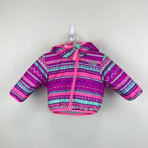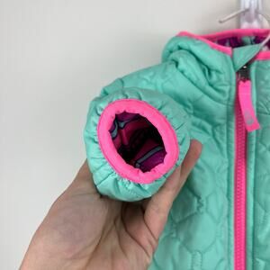 The North Face Girls Reversible Perrito Jacket. Size tag removed, but fits the same as other North Face baby girl 0-3 months (see photos for measuerments). Adorable insulated winter coat. Fully reversible. Solid light green on one side, and printed pink, purple, and green geometric stripe design on the other. Features lightweight but warm insulation, elastic binding on hood, cuffs and hem, chin zip guard, embroidered logos on front and back, and water repellent finish. Match for big sister available separately (18-24 months).