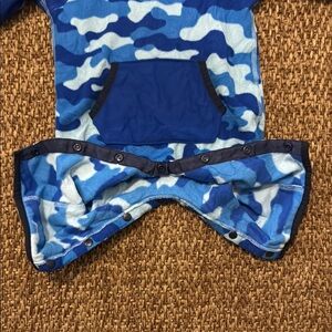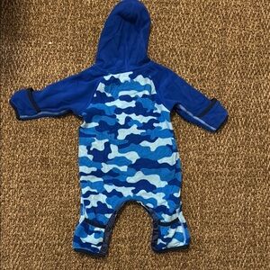 Cozy baby onesie with a blue camo pattern. Features a hood and front pocket. Perfect for keeping your little one warm.