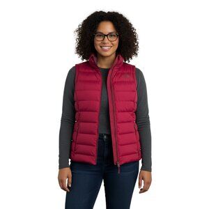 This women's The North Face Goose Down Puffer Vest in a rich burgundy is size XL, featuring a 700-fill insulation for superior warmth without bulk. The vest is stowable and in excellent used condition (EUC), making it a perfect layering piece for transitional weather or outdoor adventures. It features a full zip front and a high collar for added protection and warmth.