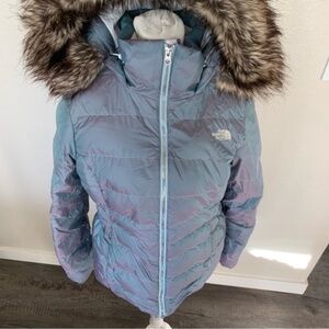 The North Face Gotham Jacket with faux furTrim in Blue Frost Iridescent
