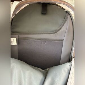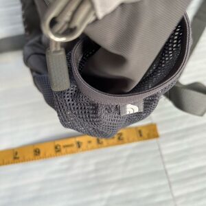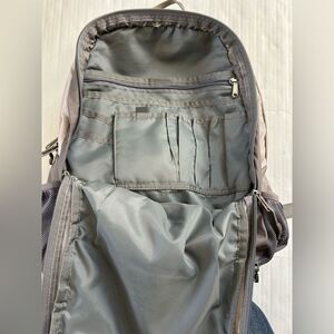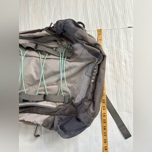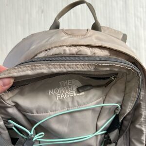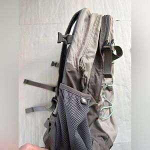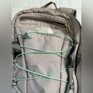 The North Face Borealis backpack in gray. Features green accents and spacious compartments.