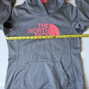 This hoodie from The North Face is perfect for any teen or junior who loves walking, hiking, or running and jogging. It features a solid pattern with a gray and pink color combination and is made of polyester material that is machine washable. The hoodie has a pullover closure and is hooded, with pockets for added convenience.