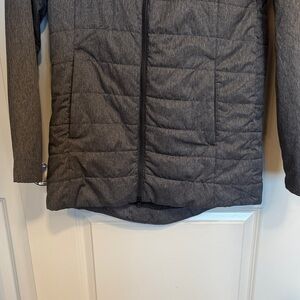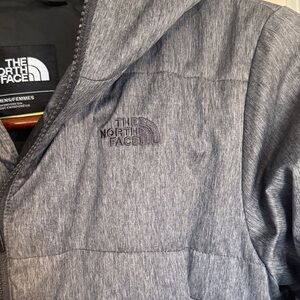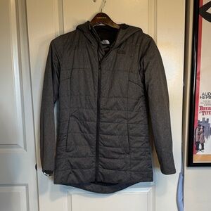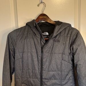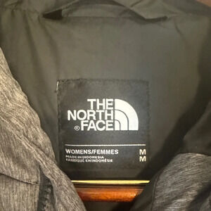 The Northface puffer jacket women’s size medium, never stop exploring Stylish gray puffer jacket. Features a hood and full zip closure. Ideal for cold weather. Longer in the back than the front no holes no rips from non-smoking home beautiful jacket.