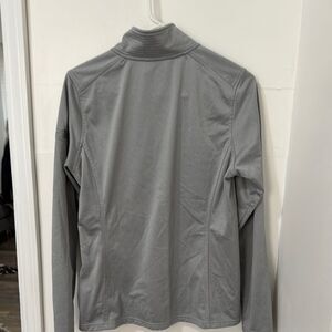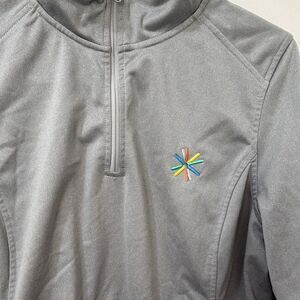 The North Face Stylish gray pullover with a quarter-zip design. Features a colorful embroidered logo on the chest.