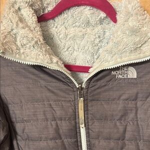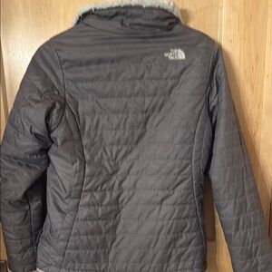 Stylish gray quilted jacket by The North Face. Features a cozy white fleece lining.