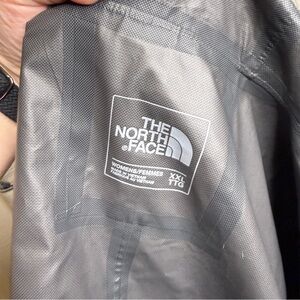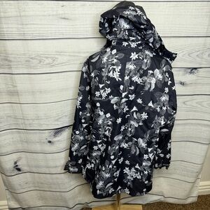 Sleek gray rain jacket by The North Face. Ideal for outdoor adventures. White floral print. Pockets.