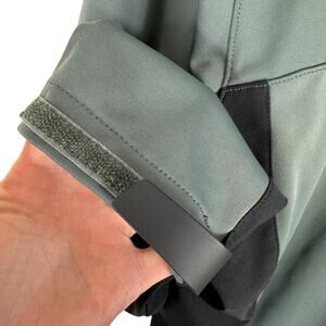 Excellent preowned condition. Green & black full zip lined mock neck lightweight jacket. Zippered pockets on lower front sides. Adjustable strap on cuffs. Polyester material. Approx. measurements: Shoulder to hem 28", pit to pit 21", sleeve from neck to sleeve hem 32". Men's Size M.