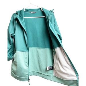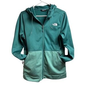 Stylish green jacket by The North Face. Features a full zip and hood. Perfect for outdoor adventures.