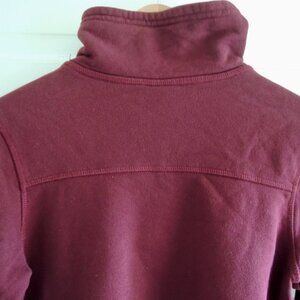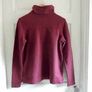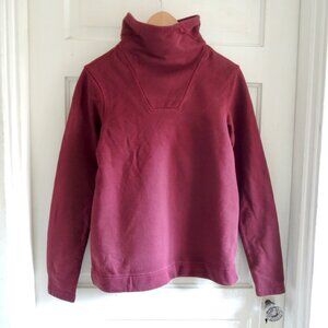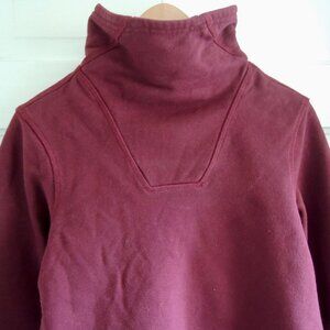 The North Face Hayes Funnel Neck Sweatshirt in Deep Garnet Red, size Medium. Comfy 94% cotton sweatshirt is pull-on style, with a wide funnel neck that to turn up for warmth or fold down. Long sleeves, small side vents at hem, square decorative stitching detail at neck. Color is a deep red, shading to burgundy. Simple, functional, and sturdy, for travel or outdoor adventure. NWT
