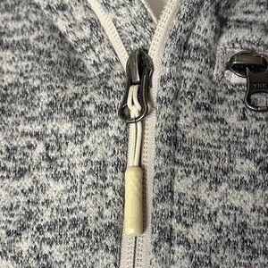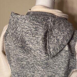 Cozy fleece jacket by The North Face. Heather gray body with cream sleeves. Full zip closure.